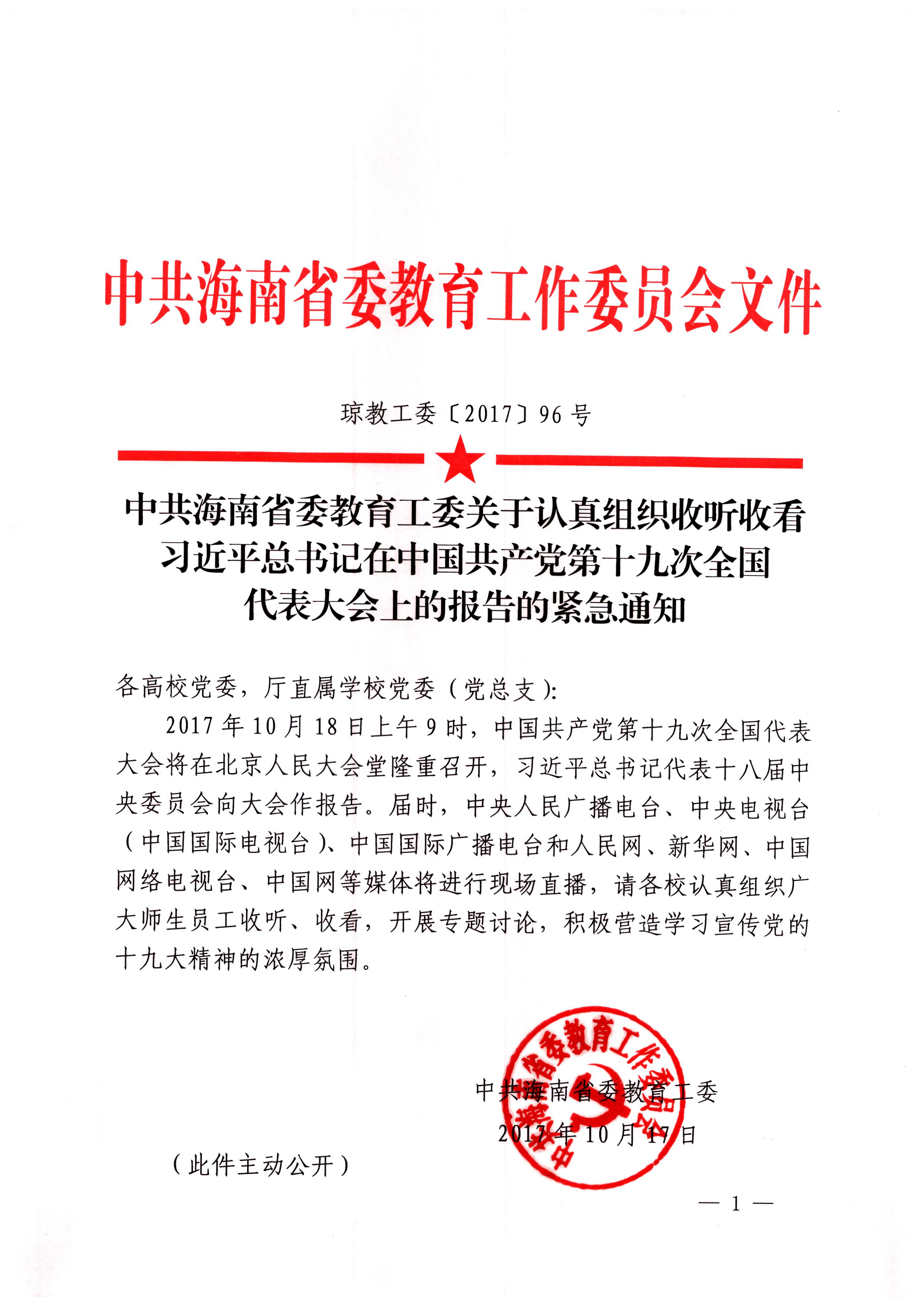 中共海南省委教育工委關(guān)于認(rèn)真組織收聽(tīng)收看習(xí)近平總書(shū)記在中國(guó)共產(chǎn)黨第十九次全國(guó)代表大會(huì)上的報(bào)告的緊急通知