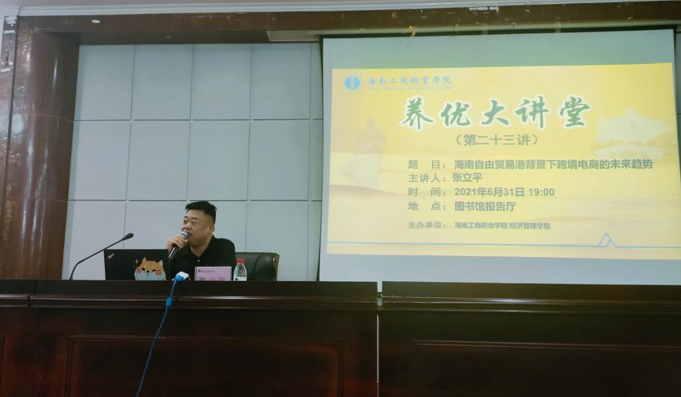 ??本網(wǎng)訊(通訊員?林麗媛)5月31日晚,“養(yǎng)優(yōu)大講堂”第二十三講—海南自由貿(mào)易港背景下跨境電商的未來(lái)趨勢(shì)在圖書館報(bào)告廳順利開講。本次講座由經(jīng)濟(jì)管理學(xué)院承辦。海南維萊雅貿(mào)易有限公司董事長(zhǎng)兼CEO、中鰲地產(chǎn)董事長(zhǎng)、曉峰傳媒負(fù)責(zé)人張立平受邀主講。