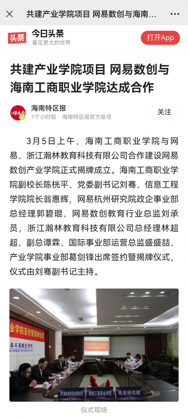 今日頭條 共建產業(yè)學院項目 網(wǎng)易數(shù)創(chuàng)與海南工商職業(yè)學院達成合作