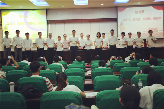 接著,由黨委委員邢瓊勇宣讀《海南工商職業(yè)學(xué)院黨政辦公室關(guān)于批準(zhǔn)何路遙等14名同志為中共預(yù)備黨員的通知》,各黨委委員為新發(fā)展預(yù)備黨員頒發(fā)結(jié)業(yè)證書、集體佩戴黨徽,亮出黨員的光榮身份,從今天起做到“黨徽一掛,責(zé)任重大;身份一亮,做出榜樣”。