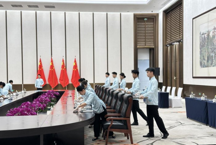 盛會一線,處處可見海工商學子的閃光身影。服務全程,師生團隊堅守崗位、精益求精,全方位融入會議服務核心環(huán)節(jié),高質量完成歡迎晚宴籌備、雙邊會見保障、中西餐廳運維等重點工作。從前期周密籌備到現(xiàn)場貼心值守,從標準禮儀儀態(tài)到跨文化從容溝通,從課堂專業(yè)積淀到賽場實戰(zhàn)輸出,同學們將旅游管理、酒店管理、禮儀服務等課堂所學融會貫通,把書本知識轉化為高標準、零失誤的實戰(zhàn)能力。