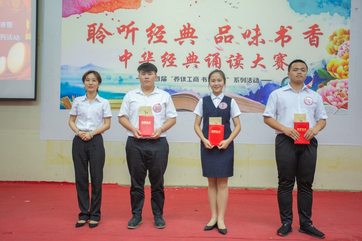 徐玲書(shū)記為誦讀大賽三等獎(jiǎng)獲得者楊富釗、余和珠、陳鵬頒獎(jiǎng)