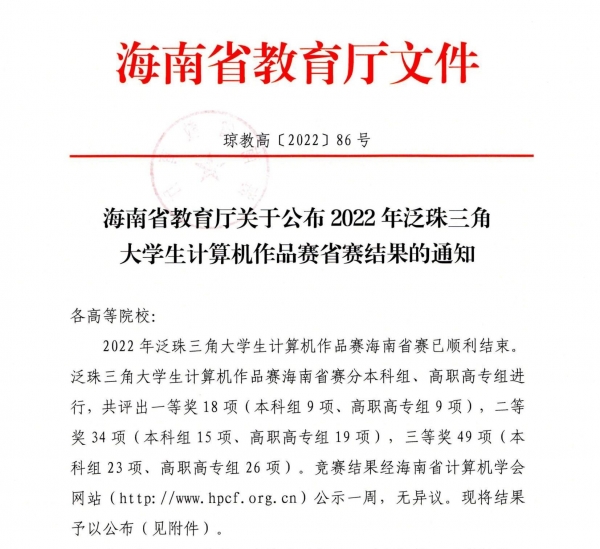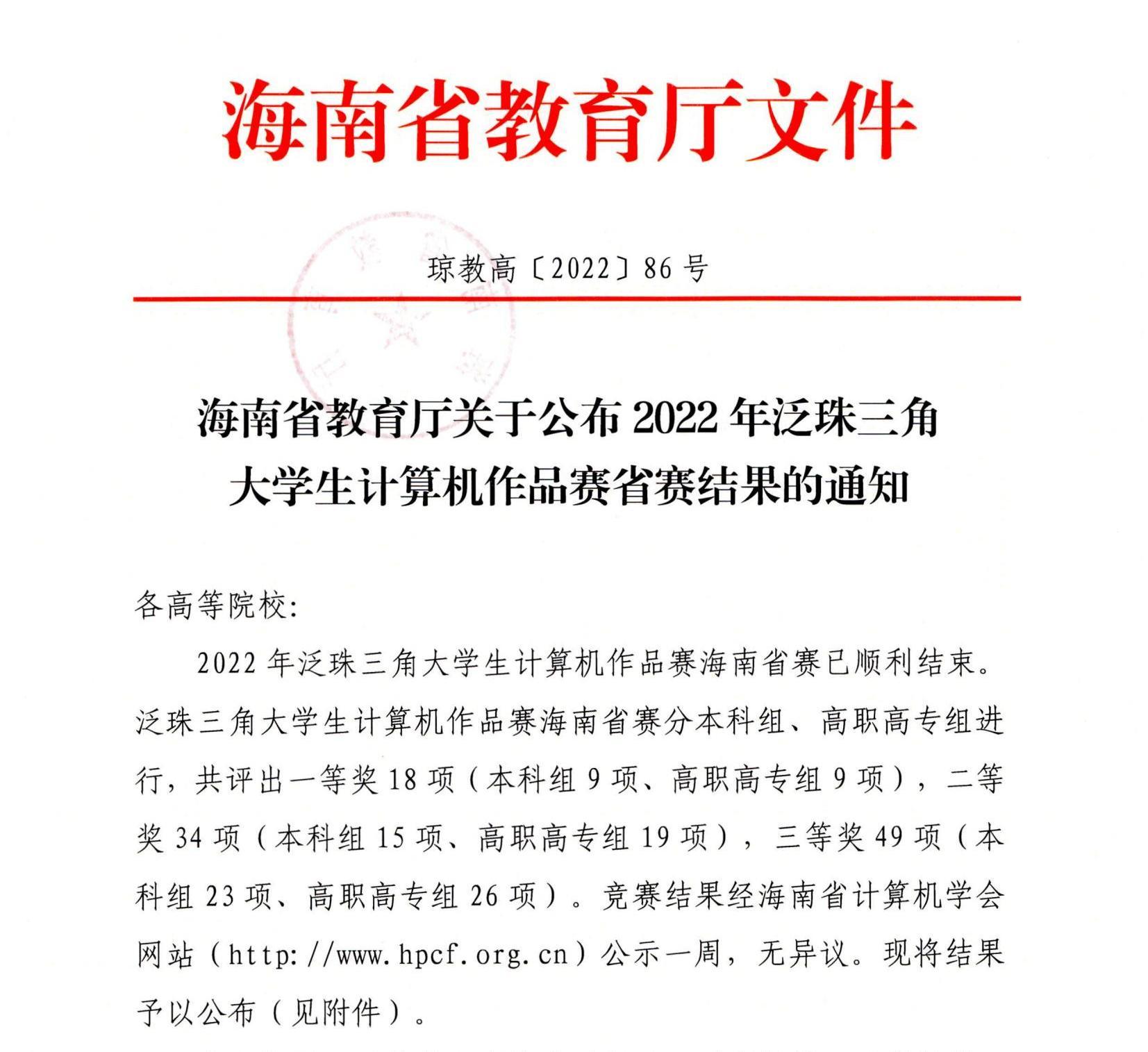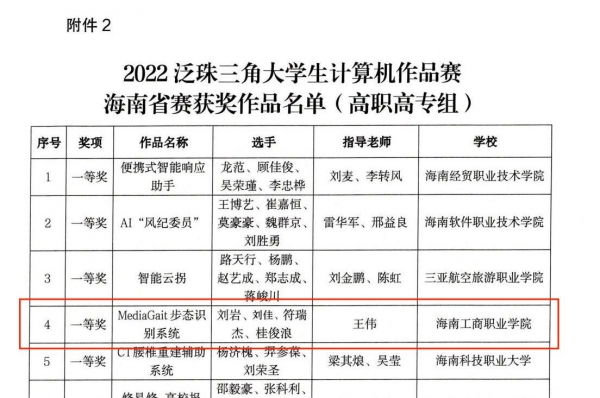 ?本網(wǎng)訊(通訊員 羊美清)近日,根據(jù)海南省教育廳印發(fā)的《關(guān)于公布2022年泛珠三角大學(xué)生計(jì)算機(jī)作品賽省賽結(jié)果的通知》,我校信息工程學(xué)院作品《MediaGait步態(tài)識(shí)別系統(tǒng)》獲得省級(jí)一等獎(jiǎng)、《何為藝術(shù)》《我的財(cái)富日記App》獲得省級(jí)二等獎(jiǎng)。