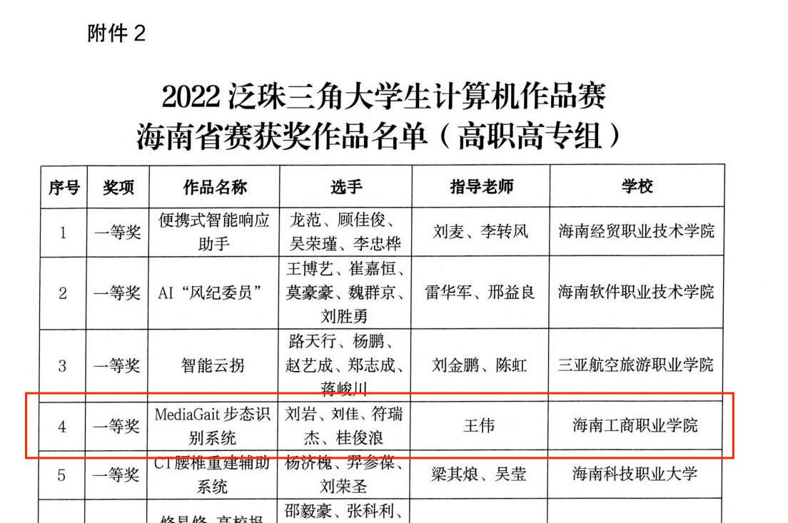 ????其中,王偉老師組的作品《Media Gait步態(tài)識(shí)別系統(tǒng)》,作為高職高專組前四名作品代表海南賽區(qū)參加今年7月25日–7月29日在澳門、珠海舉行的泛珠三角大學(xué)生計(jì)算機(jī)作品賽總決賽。
