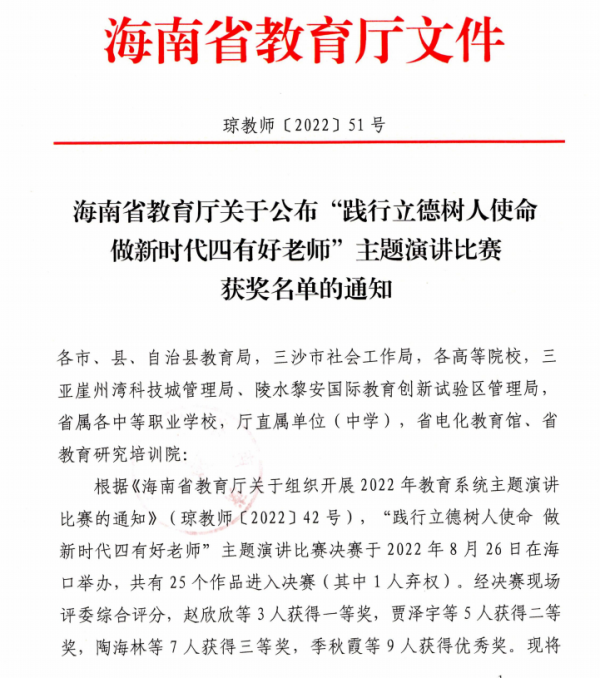 ?據(jù)悉,本次比賽由海南省教育廳主辦,決賽于8月26日在??谂e行,共有25個作品進(jìn)入決賽(其中1人棄權(quán))。本次比賽旨在提升教師思想境界,激勵其成為新時代崇高師德的頌揚(yáng)者,先進(jìn)典型的講述者和教育正能量的傳播者。