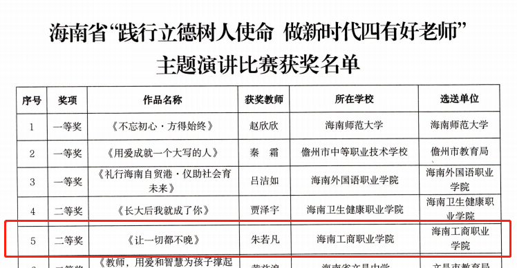 ?本網(wǎng)訊(通訊員?高?暢)近日,根據(jù)海南省教育廳印發(fā)的《關(guān)于公布“踐行立德樹人使命 做新時代四有好老師”主題演講比賽獲獎名單的通知》,經(jīng)我校人事處組織推選,我校朱若凡老師演講作品《讓一切都不晚》榮獲“踐行立德樹人使命 做新時代四有好老師”主題演講比賽二等獎的好成績。